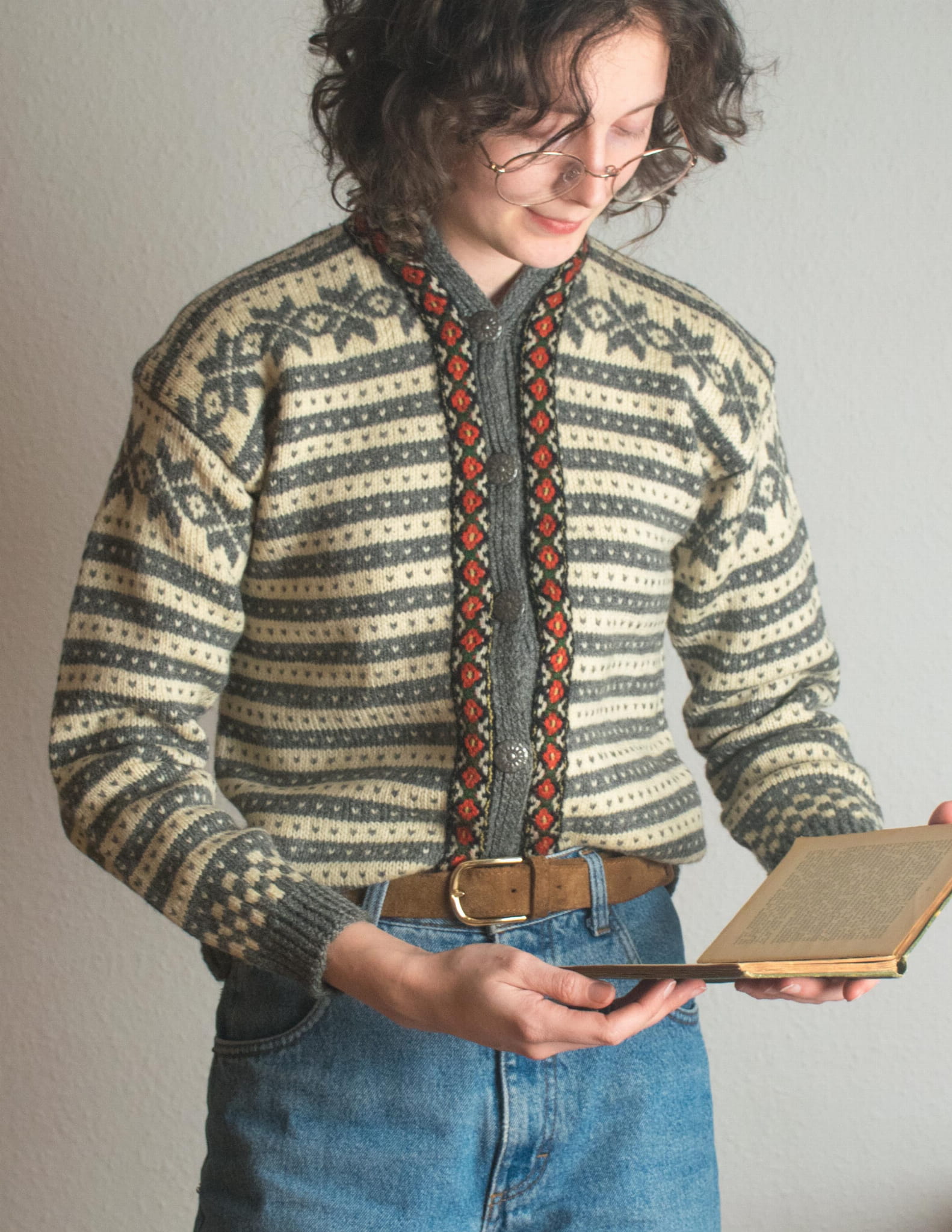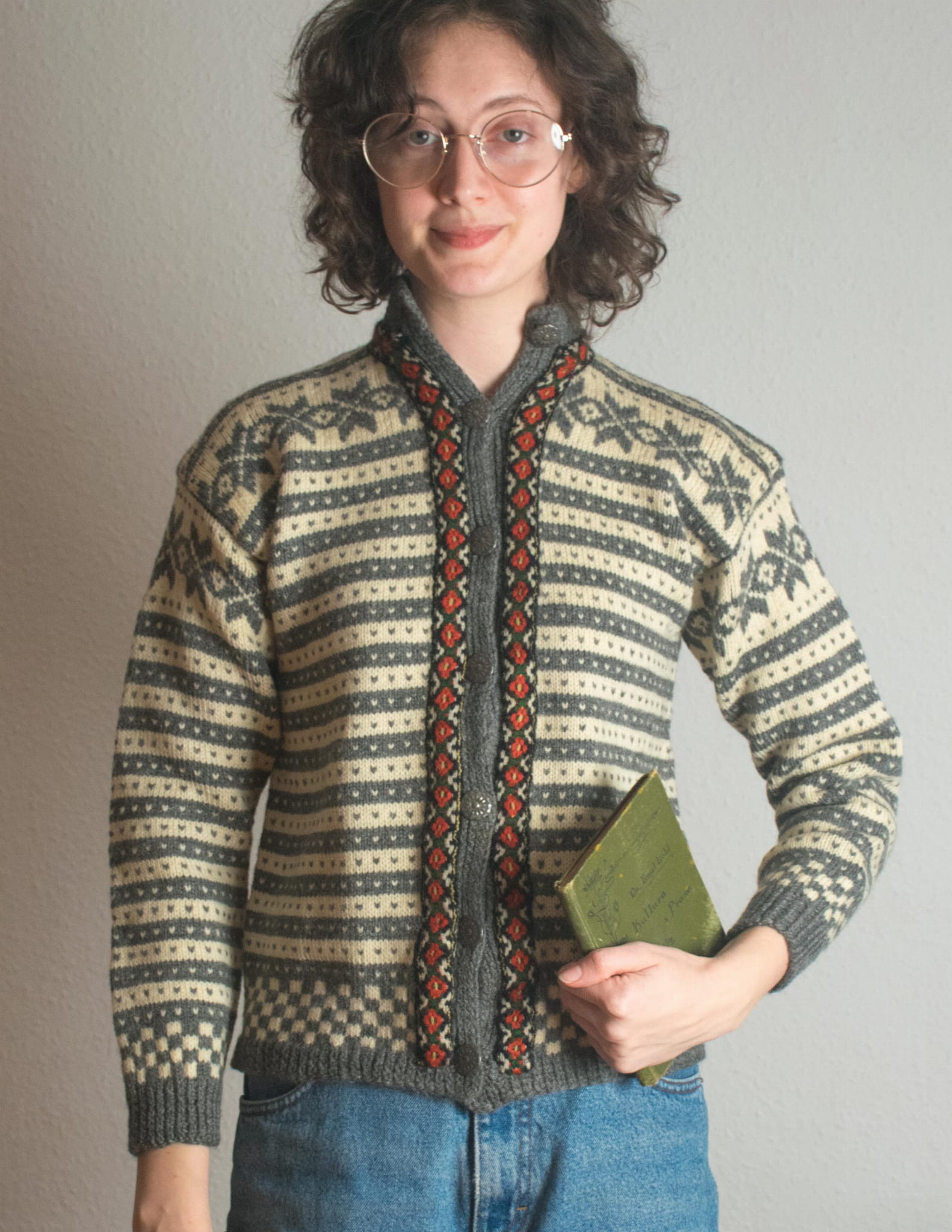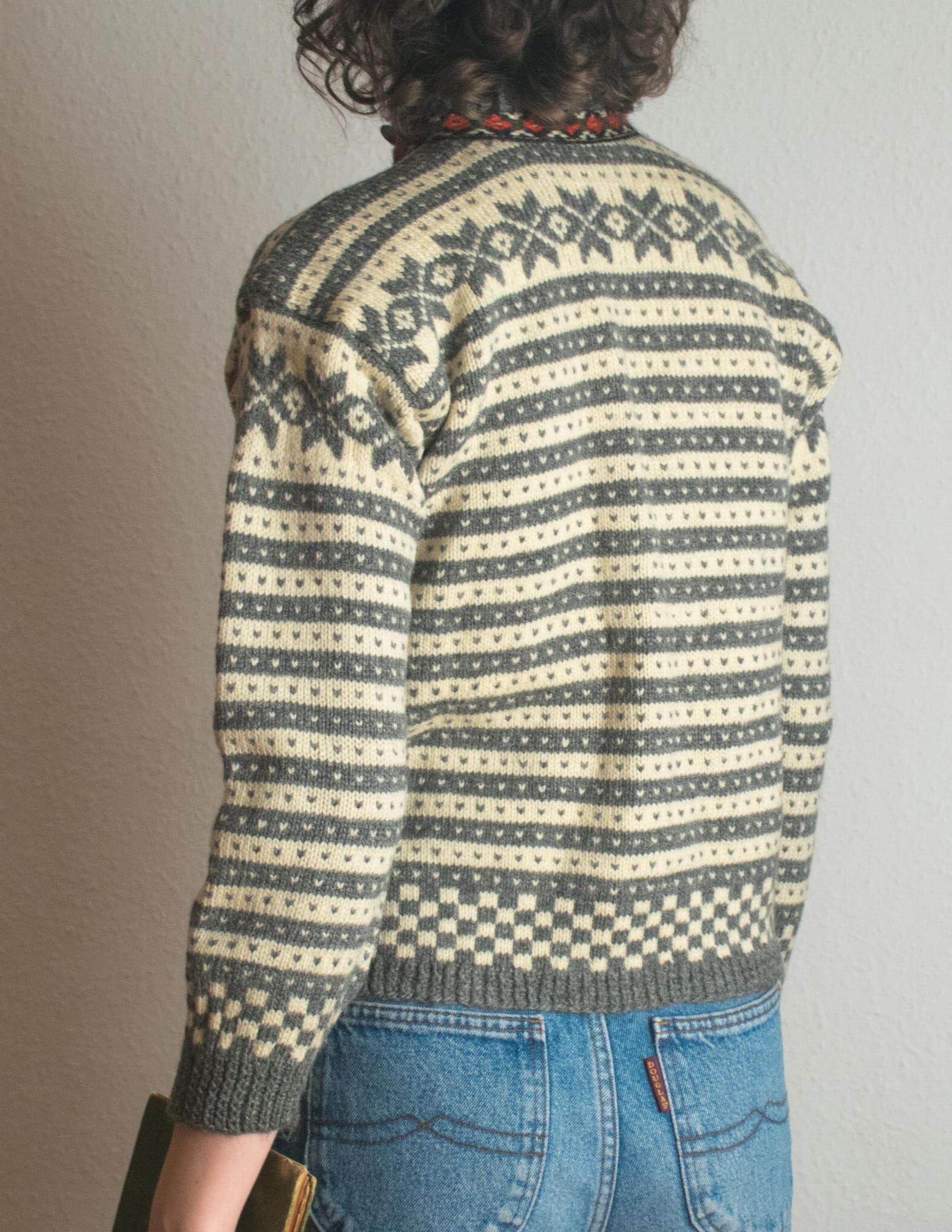 Kardigan 100% wełna norweski szary i ecru XS
