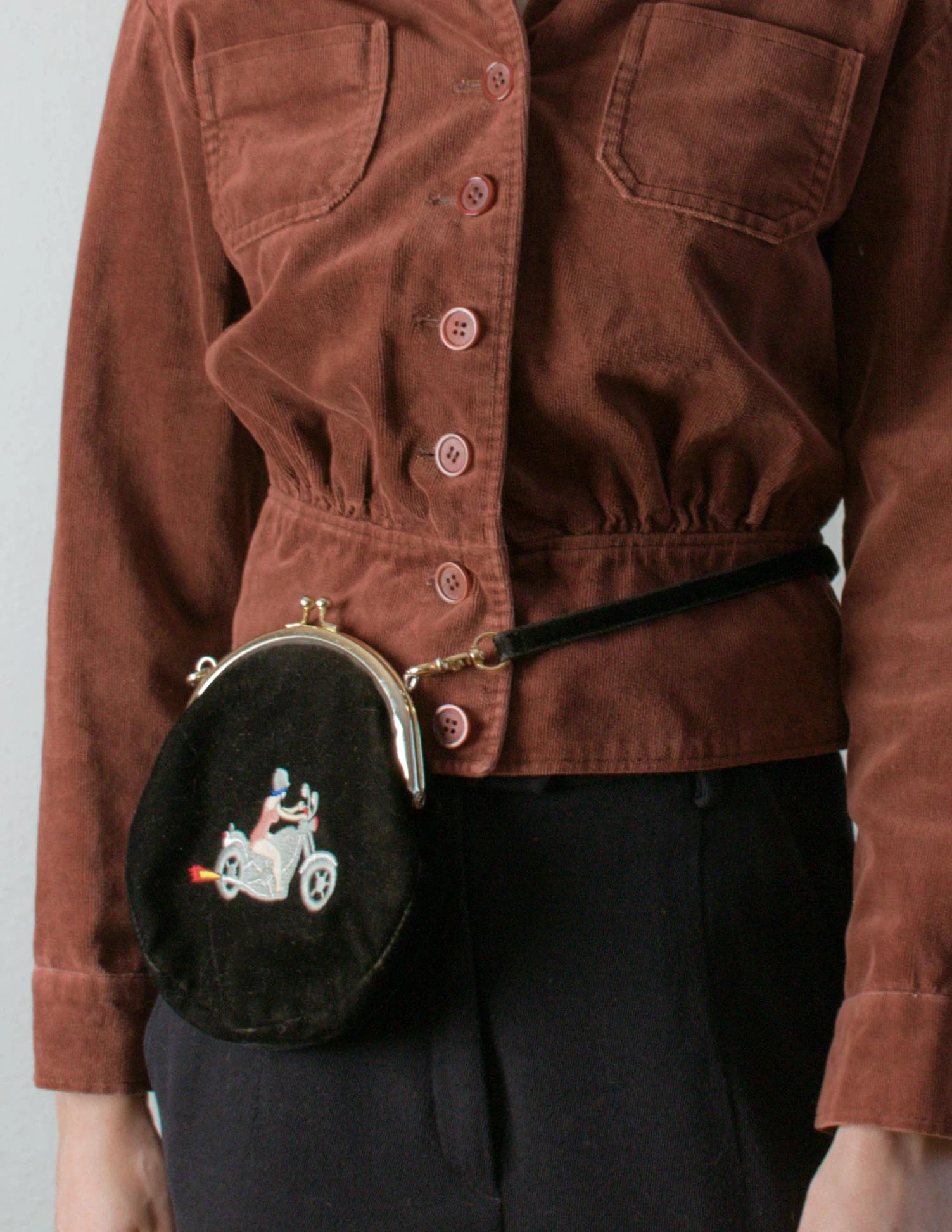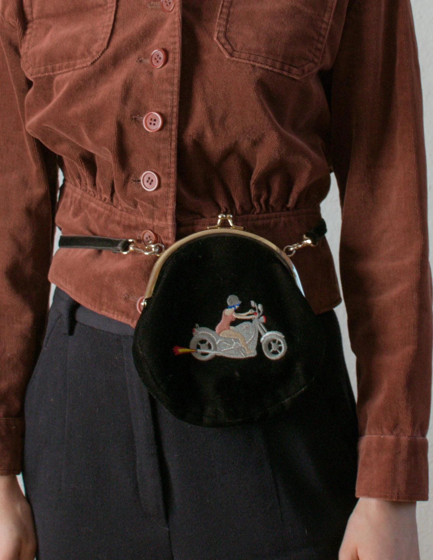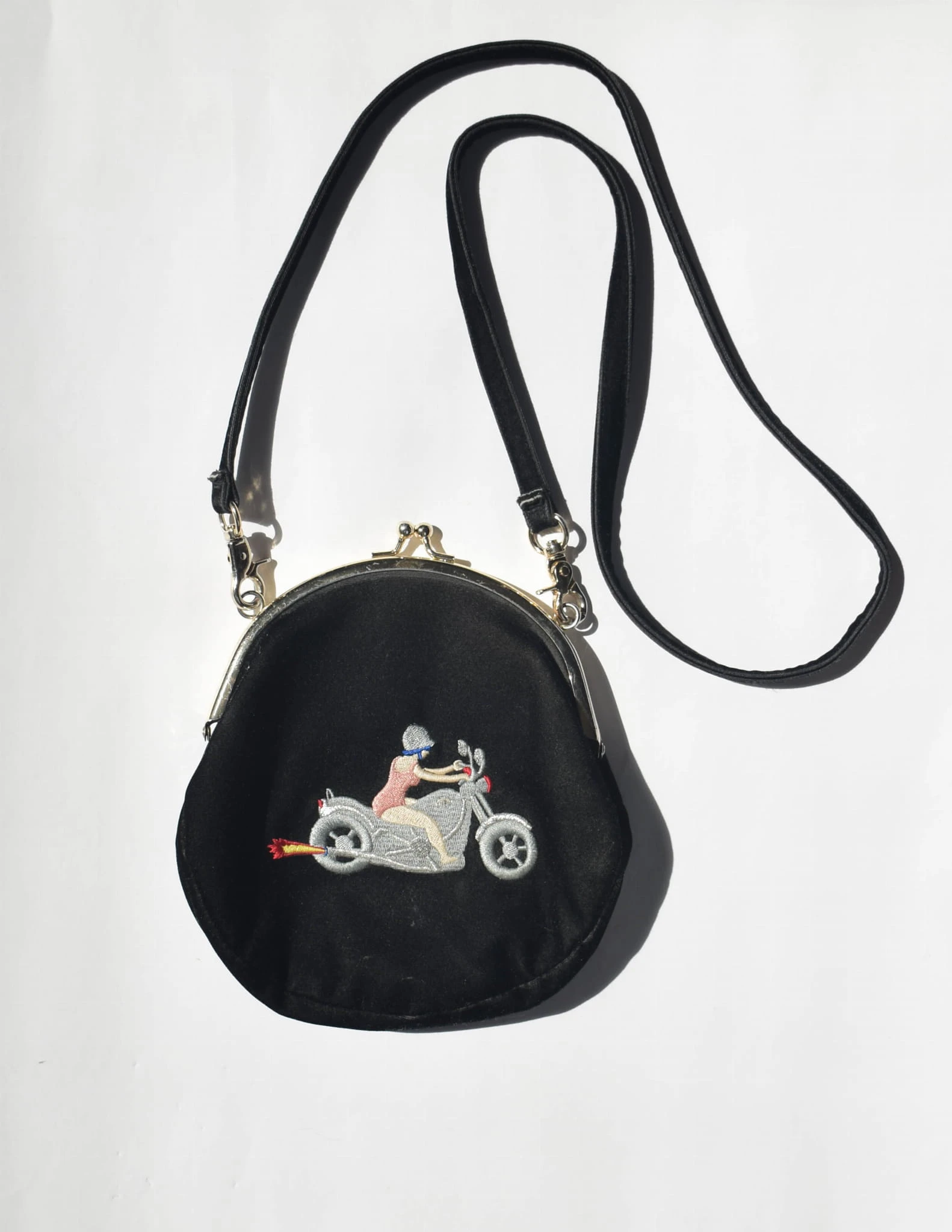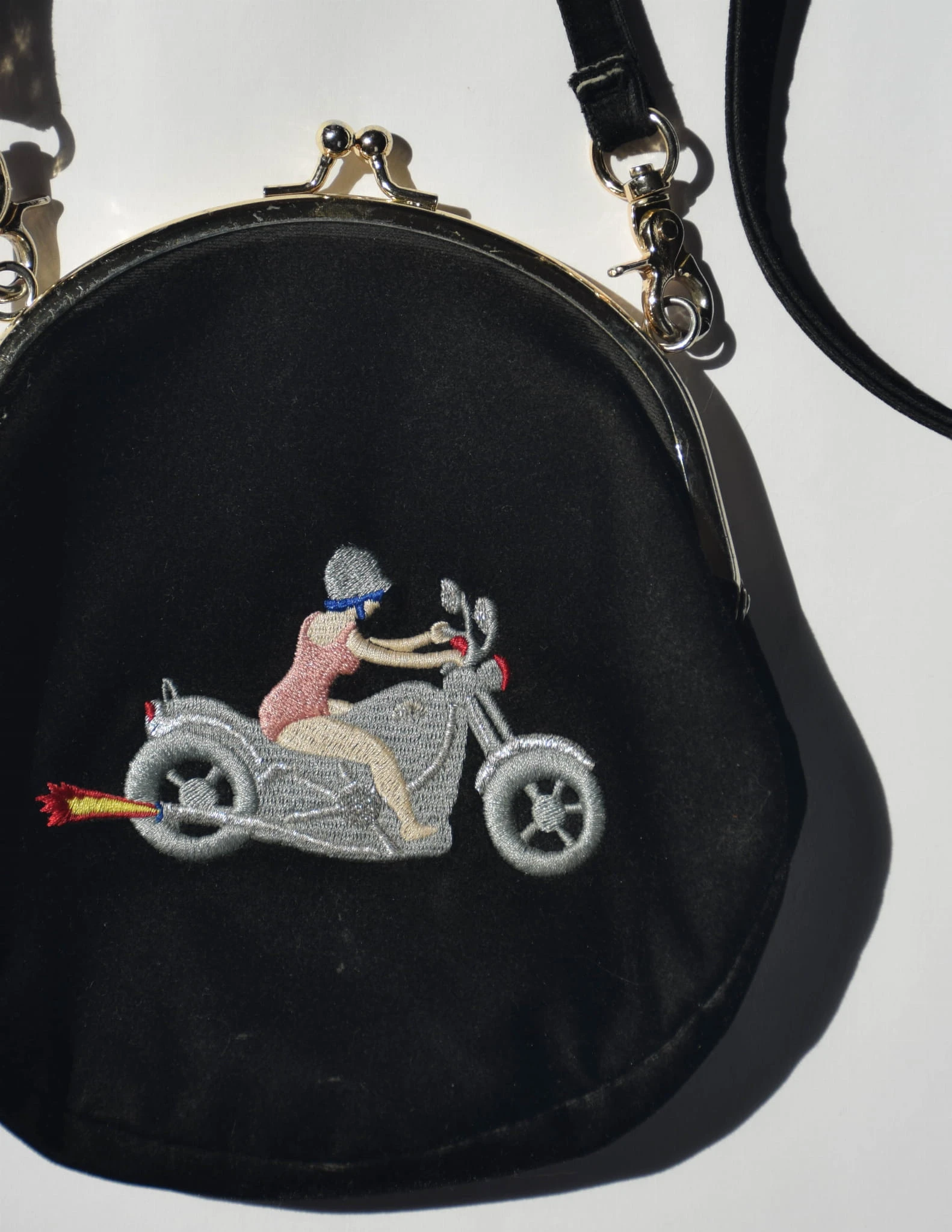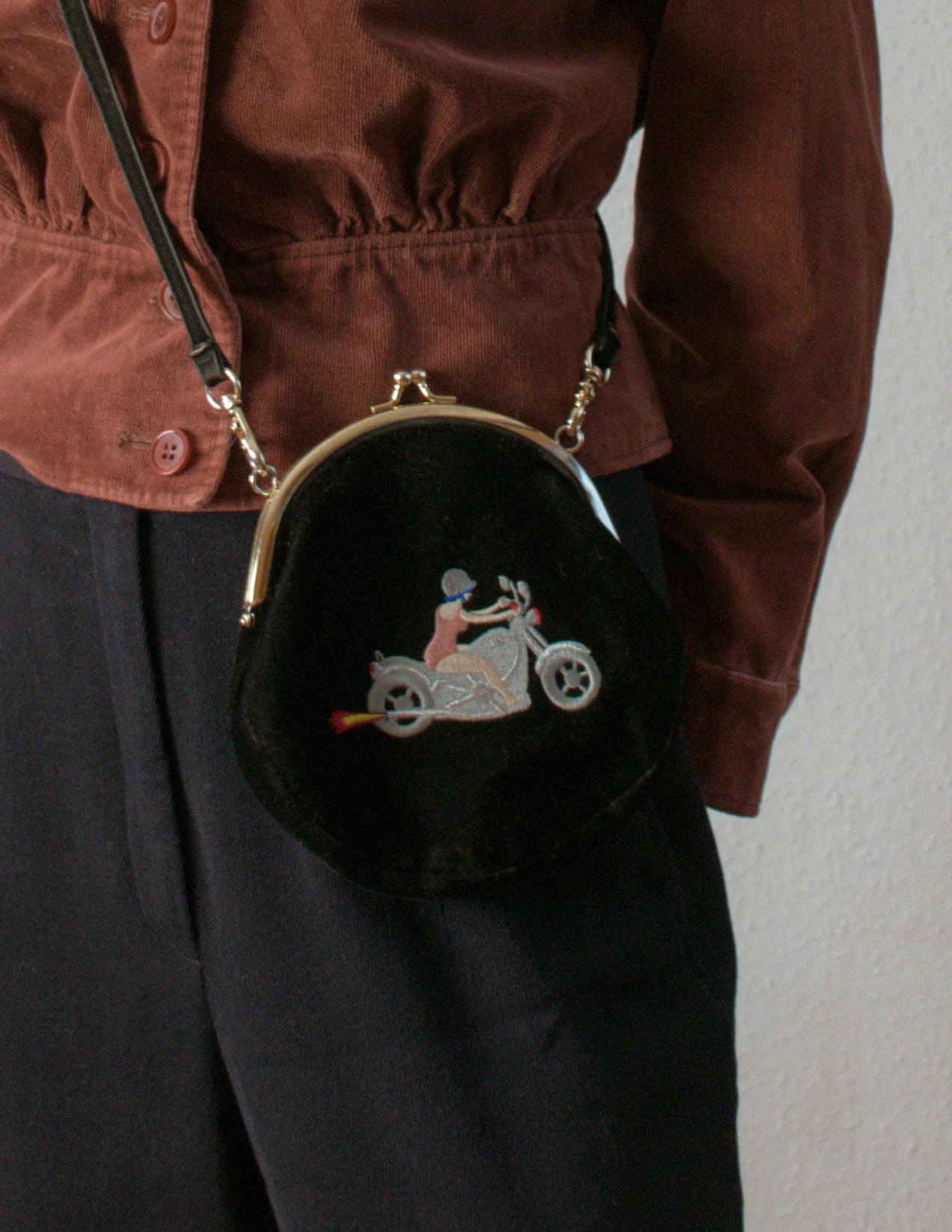 Torebka z haftem kobieta na motorze